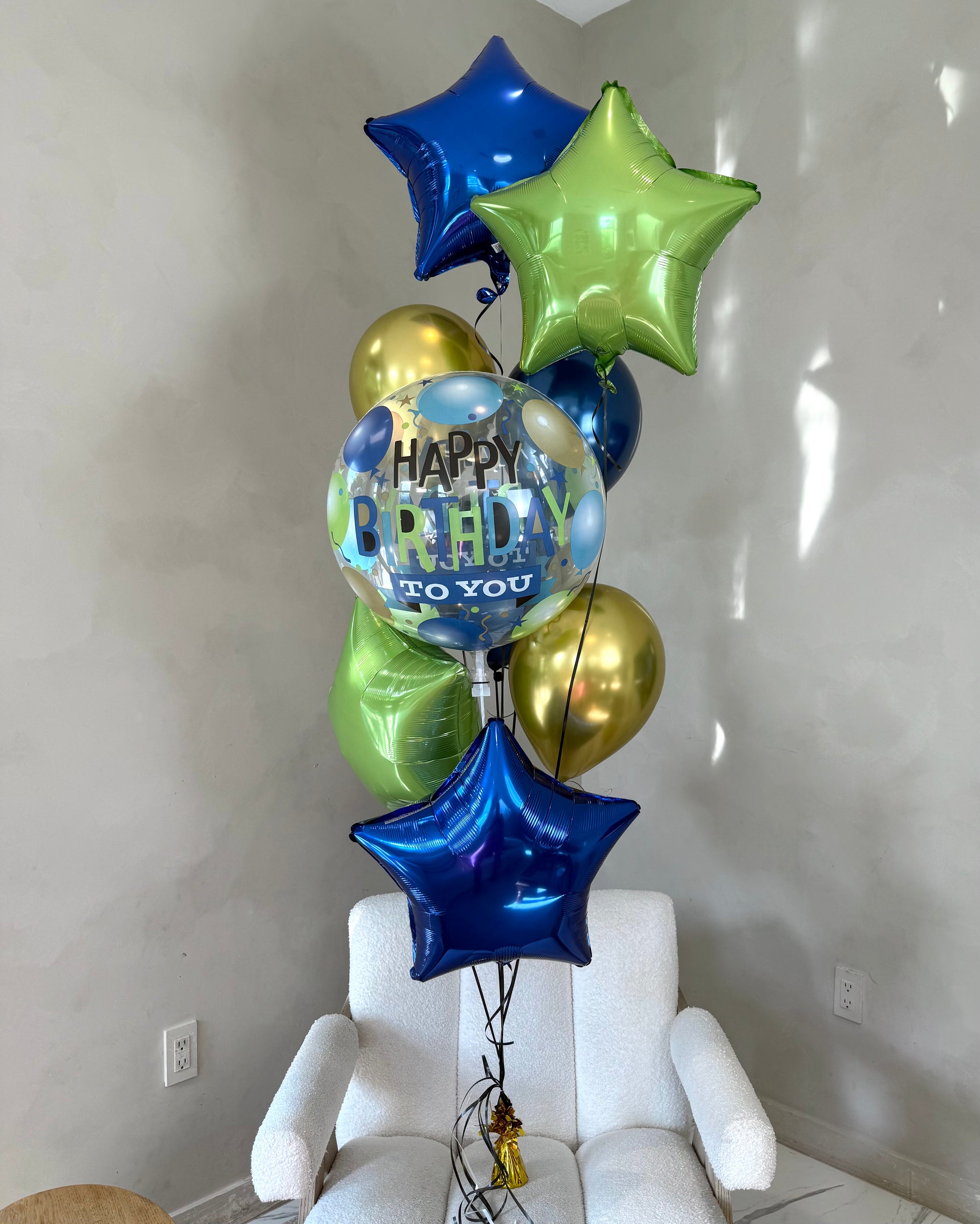 Green Gold and Blue Stars Happy Birthday Helium Balloon Bouquet With Weight