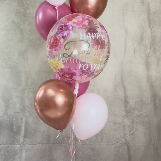 Floral Blush And Rose Gold Happy Birthday Bubble Balloon Bouquet With Weight